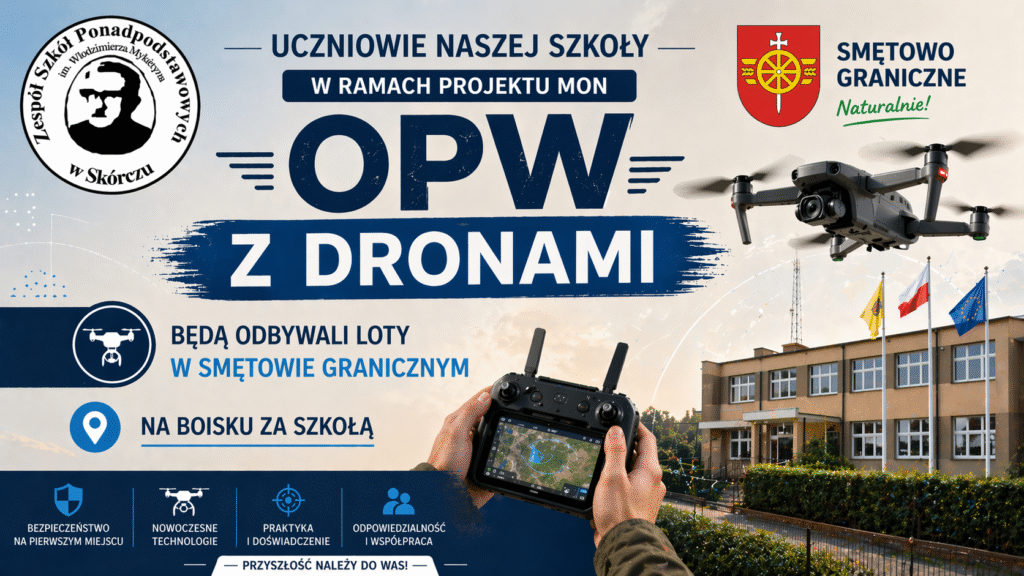 Dyrektor Zespołu Szkół Ponadpodstawowych im. Włodzimierza Mykietyna w Skórczu informuje, że w najbliższym czasie w ramach projektu MON OPW z dronami uczniowie szkoły będą odbywali na terenie Gminy Smętowo Graniczne (boisko za szkołą) testowe loty. Przedmiotowe zadanie ma zapoznać młodzież szkolną z nowoczesną technologią, ma pomóc im w zdobywaniu cennej praktyki i doświadczenia, jak również nauczyć współpracy oraz odpowiedzialności.