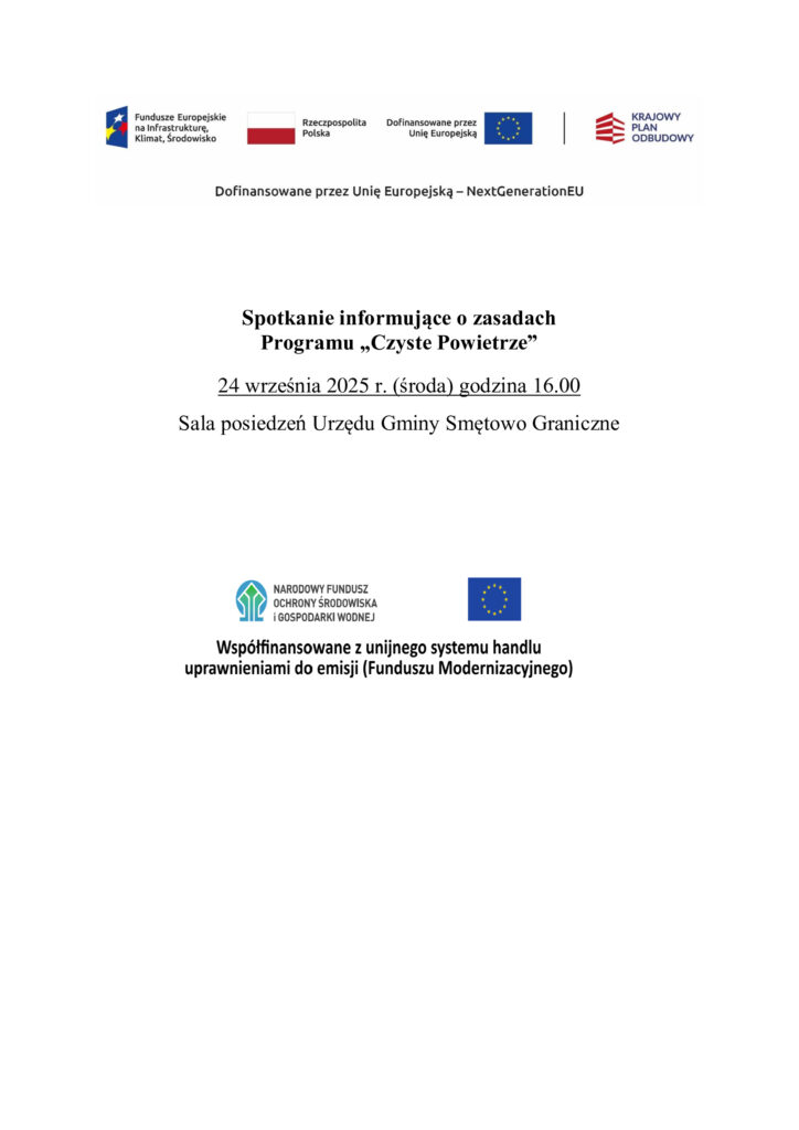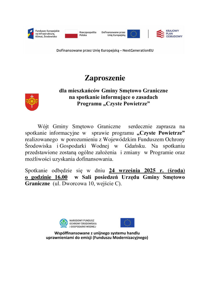 Wójt Gminy Smętowo Graniczne serdecznie zaprasza na spotkanie informacyjne w sprawie programu „Czyste Powietrze”
